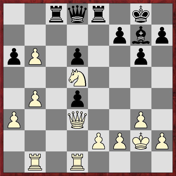 Mijn tegenstand probeerde de afgelopen zetten mijn dame te winnen met zijn paarden, maar zoals ik al vermoedde lukte dat niet. Ondertussen is het alweer bijna gelijk als zwart gewoon 23. …d5 had gedaan. Na 23. … Lf8 is het eindelijk weer echt gelijk. En psychologisch was dat wel fijn. Wel al veel tijd gebruikt (achteraf vraag ik me altijd af waaraan?).
