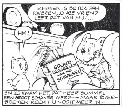 We mogen aannemen dat schaken in Rommeldam, en dan met name in De Kleine Club, een veel beoefend spel is. Immers, wat kan ‘rommel dammen’ anders zijn dan een ‘Toonderiaanse’ verwijzing naar het schaken?! Heer Bommel zelf is na grondige studie een groot schaker geworden, zo valt te lezen in het verhaal ‘Het betoverde schaakspel’. Al kan ik het als goochelaar/mentalist natuurlijk niet eens zijn met de opmerking dat schaken beter is dan toveren…