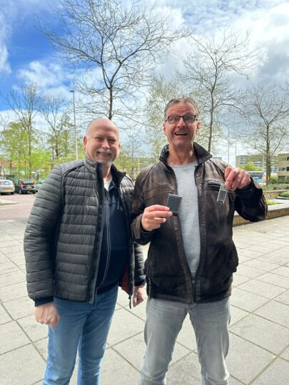 Zaterdag 20 april stond in Triton de laatste KNSB ronde van dit seizoen op het programma en het zou een zeer spannende worden. Ik had mezelf opgegeven om als vrijwilliger de schaaktafel begeleiding te doen maar had Ton van Nieuwkerk bereid gevonden voor mij in te vallen. Ik stond zodoende al buiten toen Peter Smits eigenlijk iets te laat arriveerde voor deze wedstrijd. Helaas zien we Peter niet op de clubavonden maar zijn 50-jarig jubileum was mij niet ontgaan natuurlijk en dus had ik ook voor hem de KNSB ere-speld aangevraagd. Omdat de wedstrijd inmiddels al was begonnen vond de mini ceremonie van het overhandigen van het eremetaal daarom buiten plaatst, slechts in gezelschap van gelegenheidsfotograaf Kees Pruis. Peter nam de onderscheidingen blij en trots in ontvangst.