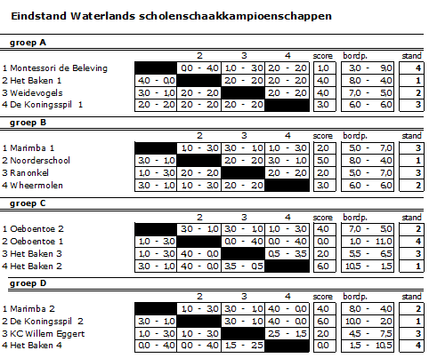 De Weidevogels – Montessori de Beleving eindigde als eerste met een winst van 3-1 voor De Weidevogels. De tussenstand bij Het Baken – De Koningsspil was op dat moment 1-2 en alle aandacht was gevestigd op het digitale scherm waar de laatste partij werd gespeeld. De kansen gingen over en weer, beide misten kansen op de winst. Zwart jaagde op een mat maar de witte koning wist uiteindelijk een veilig veld op de 6e rij te bereiken waarna wit het initiatief over kon nemen en met een keurige matvoering de winst binnenhaalde en de teamuitslag 2-2 kon laten noteren. Dat bleek net voldoende te zijn voor het kampioenschap met een verschil van slechts 1 bordpunt op De Koningsspil.
